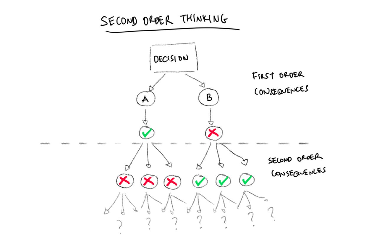 Second Order Thinking encourages you to look beyond the immediate results of your decisions, digging into the outcomes of those outcomes.